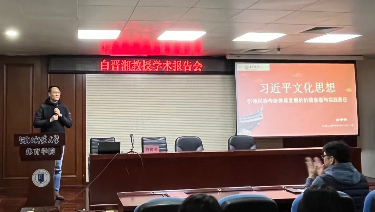 讲座中,白晋湘教授深入探讨了习近平文化思想的核心理念及其对民族文化传承和发展的深远影响。他指出,民族传统体育作为中华文化的重要组成部分,蕴含着丰富的历史文化内涵与民族精神。白教授强调,在新时代的背景下,我们应当充分挖掘和传承这些珍贵财富,以推动民族传统体育的创造性转化与创新性发展。他的演讲不仅深入剖析了民族传统体育在当今社会的重要价值,还探讨了如何在实践中有效落实这一思想,教育者如何培养学生的民族自豪感,研究者又该如何在创新中寻求突破,为金年会师生提供了一场学术盛宴。